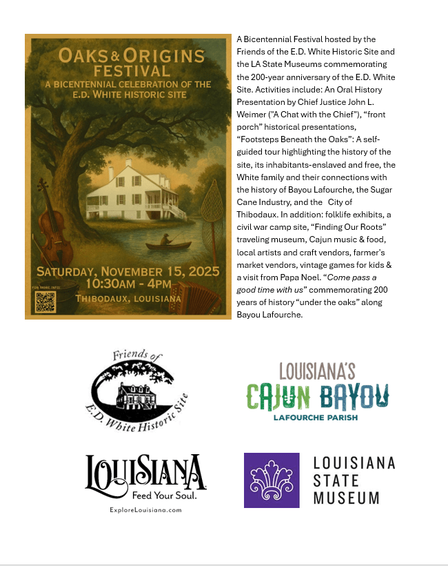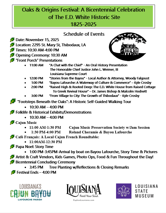 You will learn more about the people who build this land, exciting community programs, and so much more when you visit E. D. White Historic Site. We are happy to share that we are open to the public, Tuesday – Saturday, 10:00 a.m. – 4:30 p.m. Student field trips are also free. Groups of 10 or more should call ahead for availability.